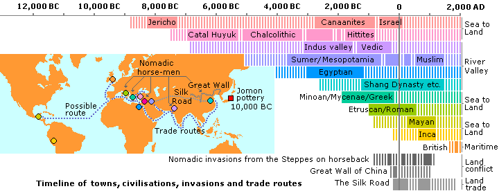 The Bronze Age began when the mariners round the Aegean Sea discovered how to smelt bronze using copper mixed with small amounts of tin or arsenic. Copper smelting requires a great deal of fuel and by the end of the Bronze Age, the heavily forested islands of Cyprus and Crete had been cut down, contributing to its decline. Horses were first tamed in the Steppes of Russia and this made it possible for men to travel by horse as easily as by boat. Some of the tribes inhabiting the northern rivers of Siberia exchanged their riverine life style for a nomadic one on horseback and then came down in several waves from the north to conquer the maritime peoples of the northern Mediterranean. The Great Silk Road, the route that linked China with the Mediterranean, was first made possible with horses and mules. The Iron Age began with the Hittites, living by the iron rich sands of the Black Sea. The Greeks, having defeated the Hittites, started using slaves to take over their iron furnaces on the Black Sea coast. Early steels were discovered by adding small amounts of carbon to iron as it was hammered over a charcoal fire. Mining developed and slave driven pumps were used to keep the mines from flooding. Unlike the smelting of bronze, this new technology required large numbers of land based slaves and, within a few generations, the maritime trading civilisations of Mycenae, Minoa, Carthage and Phoenicia were defeated first by Greece and then by Rome. Their technology and culture were absorbed into the Classical tradition and finally, as the Roman empire itself fell, in 476 AD, a small band of Benedictine monks were left to carry its cultural heritage into northern Europe, where our present Industrial Age was to have its origins. |