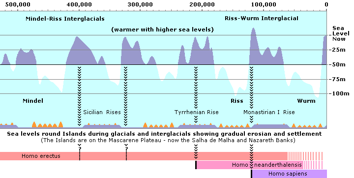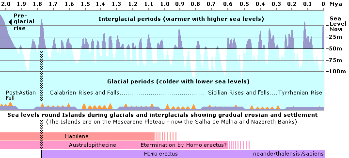 The type of hominid that was cut off from India and left isolated on the Mascarene Plateau, when it separated from India, is unknown. All we can know for certain is that while the plateau was separating from India, 65 million years ago, there was a mass extinction and recent research shows that such extinctions are followed by explosive phyletic evolution. There is increasing evidence that India contained several advanced primates and that after colliding with Asia, these primates spread east into Southeast Asia and west into Eurasia. From Eurasia they entered Africa. Some may have survived on the land but their development was to be quite different from those that were isolated on the Mascarene Plateau. Over the next sixty million years the isolated hominids on the Mascarene Islands had time to develop some unusual characteristics. Like their australopithecine cousins, they were already bi-pedal, but being forced to live in an aquatic environment, they learnt to swim and dive for shellfish. The requirement for diving may have modified their larynxes through natural selection which enabled the hominids to breathe so that their vocal sounds could be modified. The idea that it was an aquatic environment that gave humans their characteristic differences from other apes was first postulated by Sir Alistair Hardy and later developed by Elaine Morgan and is known as the Aquatic Ape Hypothesis. Like most arboreal primates they had inherited instinctive traits of nest-building and manual dexterity and, over millions of years, they developed these nest building instincts into the conscious creation of simple reed boats. |