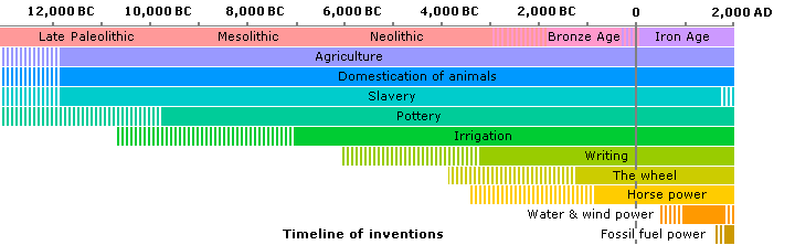 During the Late Paleolithic, the domestication of animals and slaves was made possible by the development of agriculture. For the first time, large numbers of slaves and animals could be fed, allowing the elite time to carry out building projects and to pursue arts and crafts using the more talented of the slaves. Writing and numbers were developed in order to organise the increasing maritime trade. |