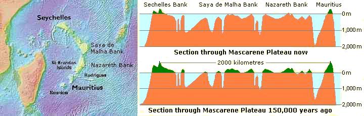 Continental Drift was first proposed in 1912 by a German meteorologist, Alfred Wegener. Using geological, zoological and palaeontological data, he showed that, around 200 million years ago, the super-continent Pangaea began to split apart into two large continental landmasses - Laurasia in the northern hemisphere and Gondwanaland in the southern hemisphere. These two super-continents continued to break apart into the various smaller continents that exist today. Twenty years after Wegener's death, his theory was finally accepted in the 1950's after an American Naval Officer, Harry Hess, chanced on the mechanism for continental drift while carrying out sonar operations during the second world war. He found that volcanic magma, pouring out from the interior of the Earth, was causing mid-ocean ridges that were slowly pushing the continents apart over the top of the Earth's hot mantle. Further study led to the new theory of Plate-tectonics that not only explains the movements of continents but also the origin of mountain ranges and such things as why British eels spawn as far away as the Sargasso Sea. The Mascarene Plateau was left as an isolated archipelago in the Indian Ocean extending from the Seychelles to Mauritius. Its complete history is still not fully understood but it seems that the northern part was part of India while the southern parts were created later through volcanic activity. The limestone banks found on the plateau indicate that it once contained coral reefs, probably a huge archipelago stretching over the plateau. |