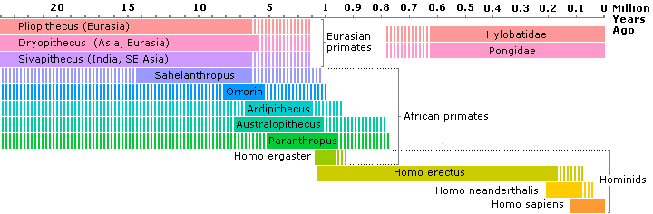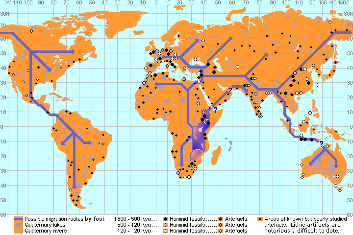Over the next 500 thousand years, waves of migrants travelled around the continents settling along rivers and lakes that were as similar as possible to their old Island habitat. The mingling of their genes with their existing cousins would have had the effect of widening the gene pool and allowing for wider natural selection to take place. There is no doubt that, providing relationships were kept relatively peaceful, that both the newcomers and the existing inhabitants would have had much to learn from each other. |