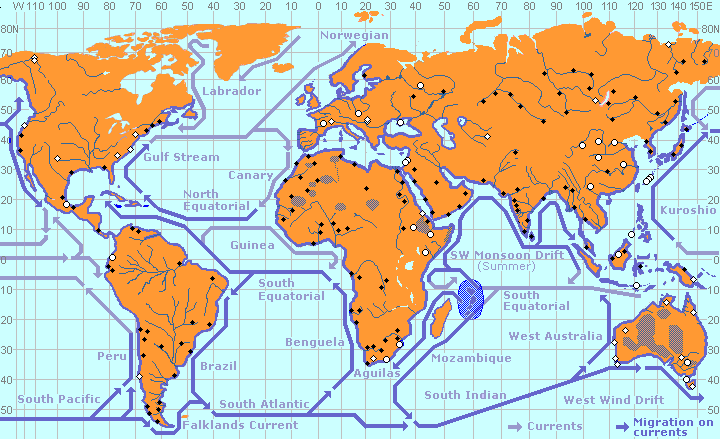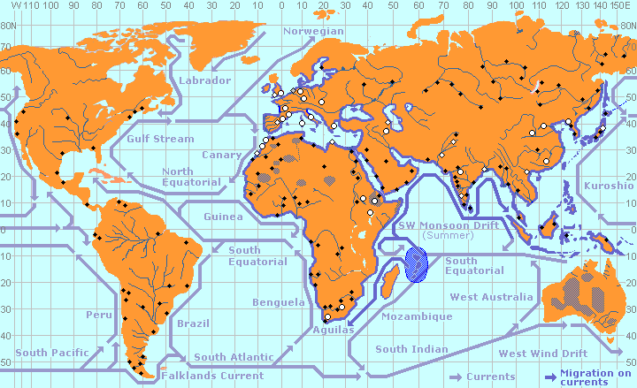 The migratory paths of the Islanders between 1,800,000 and 500,000 years ago follow the fossils and artefacts that have been found so far. The safest route for the drifting hominids would have been northwards along the African coast until they reached the, then flooded, Djibouti and Afar regions of Ethiopia. These flood plains would have been similar to their Island habitat and may have become the first homeland of the Islanders outside their Eden. The search for new habitats led to a gradual migration along the shores and currents of the Indian Ocean, beginning with Persian Gulf, India and Indonesia. This was followed by a migration round the Mediterranean up to the shores of the Black Sea and into the vast marshlands north of the Caspian Sea. |