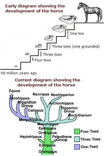 Horse evolution was never as straightforward as Marsh's smooth fossil sequence suggested and its ancestral tree sprouted numerous branches, many of which led to species that no longer exist. The simple 'ladder' has now had to be replaced with bushy diagrams such as that shown above. Darwin's Theory is of immense importance since it has taken us away from an 'interventionist' theory of life to a natural one and it is now upheld by the majority of scientists. The problem with the theory is that it is only partially true - natural selection clearly does cause gradual changes that ensure the survival of a species. It can even, as Ernst Mayr has pointed out, create new species if a group becomes completely isolated from its origins. But this ability to change is built into life itself. Today we know far more than Darwin about the complexities of genetics and we now know that it is this 'built-in' variability that Darwin and Wallace observed. Even if gradual changes could create new species, they are unable to explain how complex life, with its kingdoms, phyla, classes and orders, originated in the first place - before this built-in variability existed. It is also far from proven that small adaptations can, of themselves, create say the eye of an eagle or the ear of a shark. It is therefore quite reasonable to suppose that there is, as yet, some unknown mechanism involved. To believe that there may be some unknown factor involved in the creation of the living world does not mean going back to a 'God of the Gaps', but it does mean scientists facing up to the truth rather than cling to an outdated paradigm as did the Catholic Church with Galileo's discoveries, four hundred years ago. To return - press the Back Button on your browser |